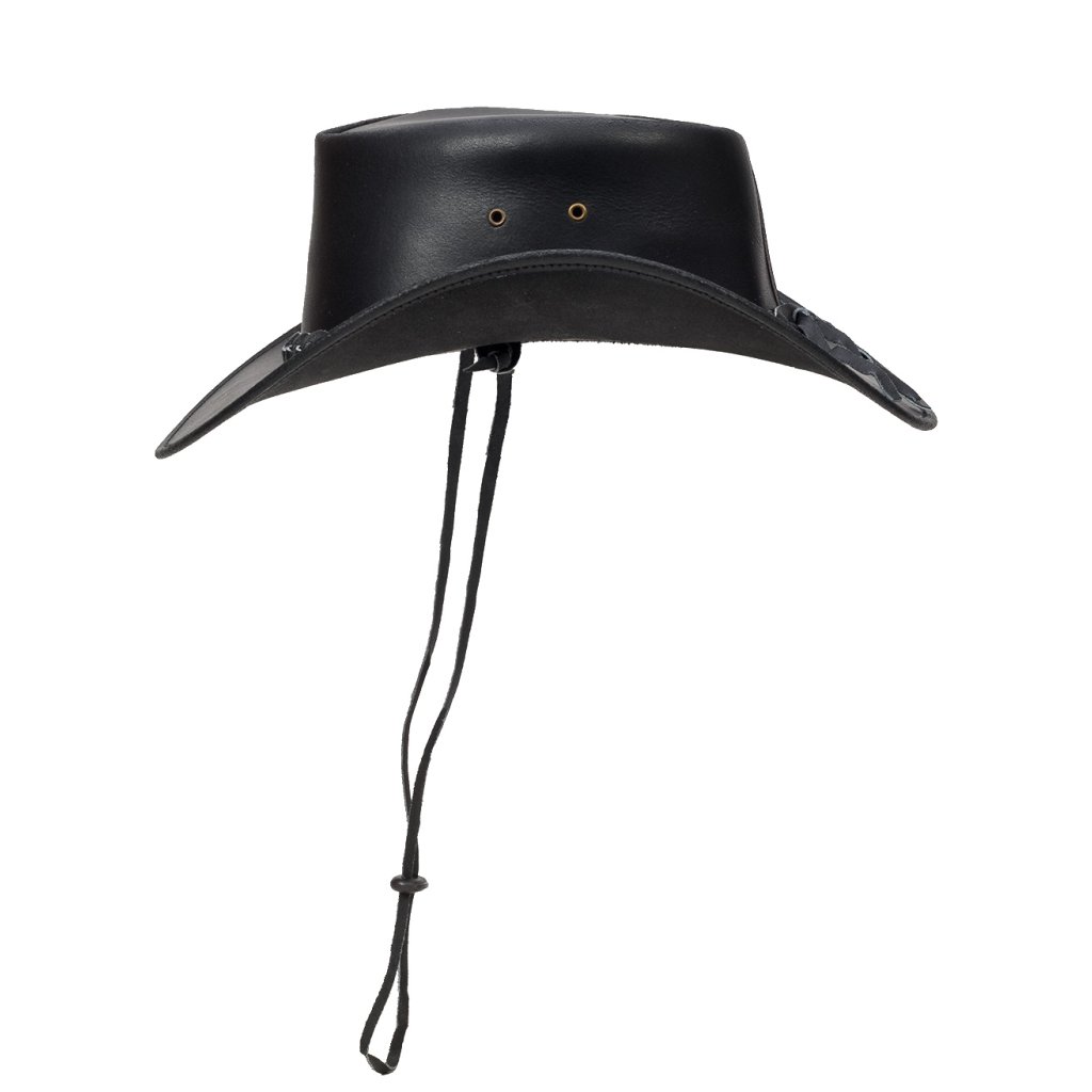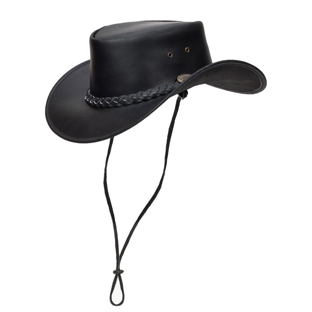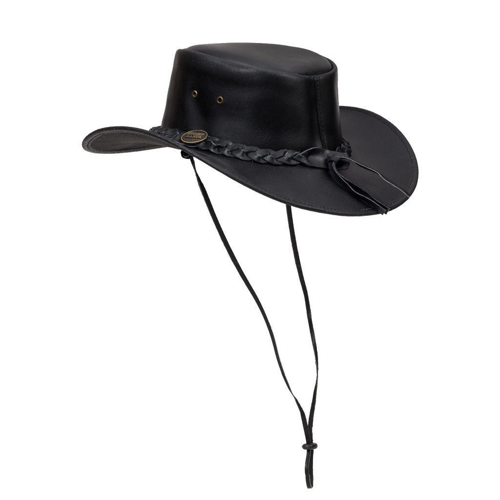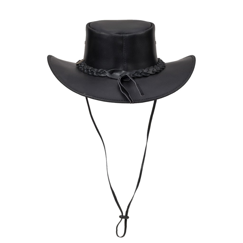 Australský kožený klobouk Ironbark – černý s pleteným páskem a šňůrkou