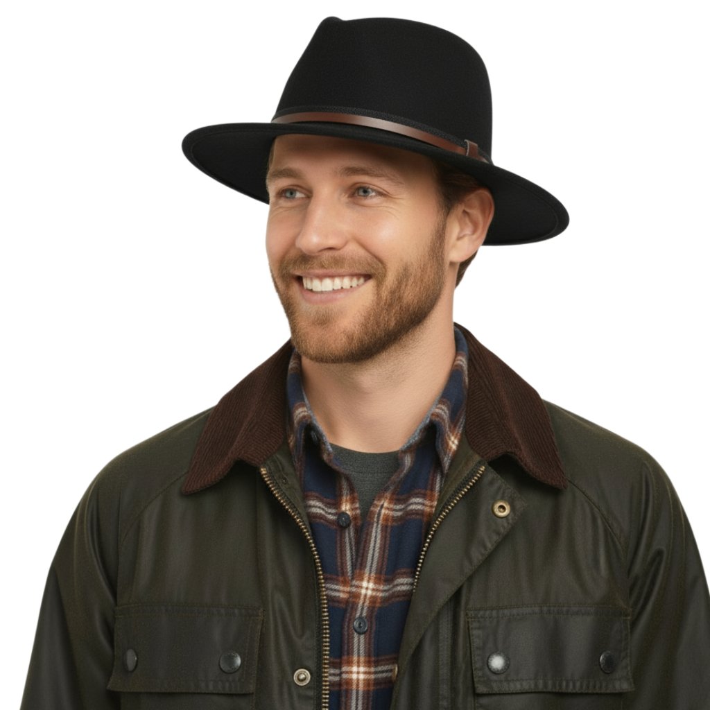 Cestovní klobouk vlněný od Fiebig - černý s dvoubarevnou koženou stuhou - širák