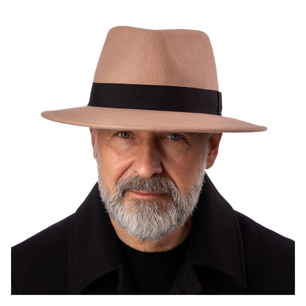 Cestovní nemačkavý klobouk vlněný od Fiebig - béžový s černou stuhou