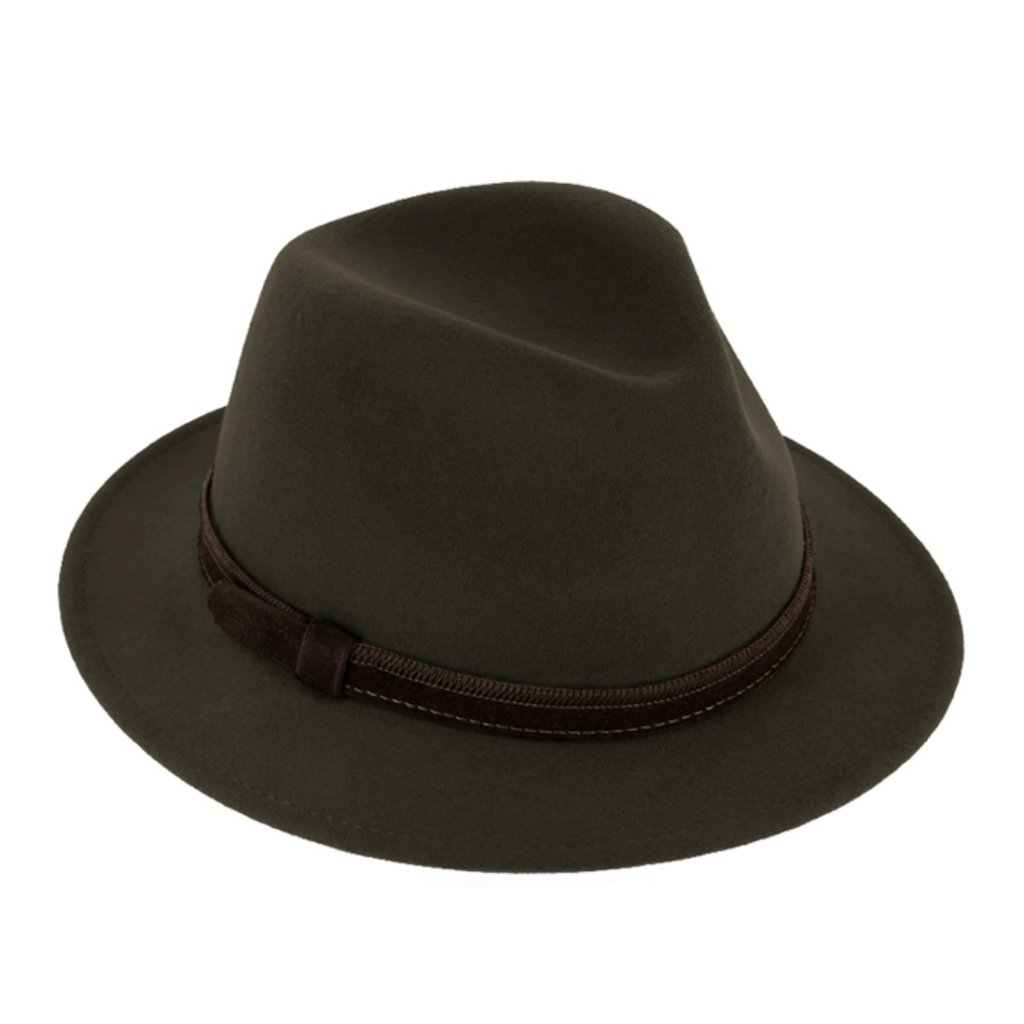 Cestovní olivový voděodolný klobouk vlněný od Fiebig s menší krempou a ušní klapky
