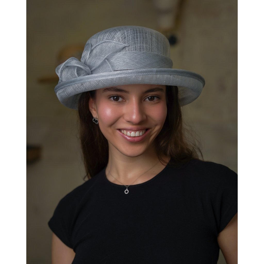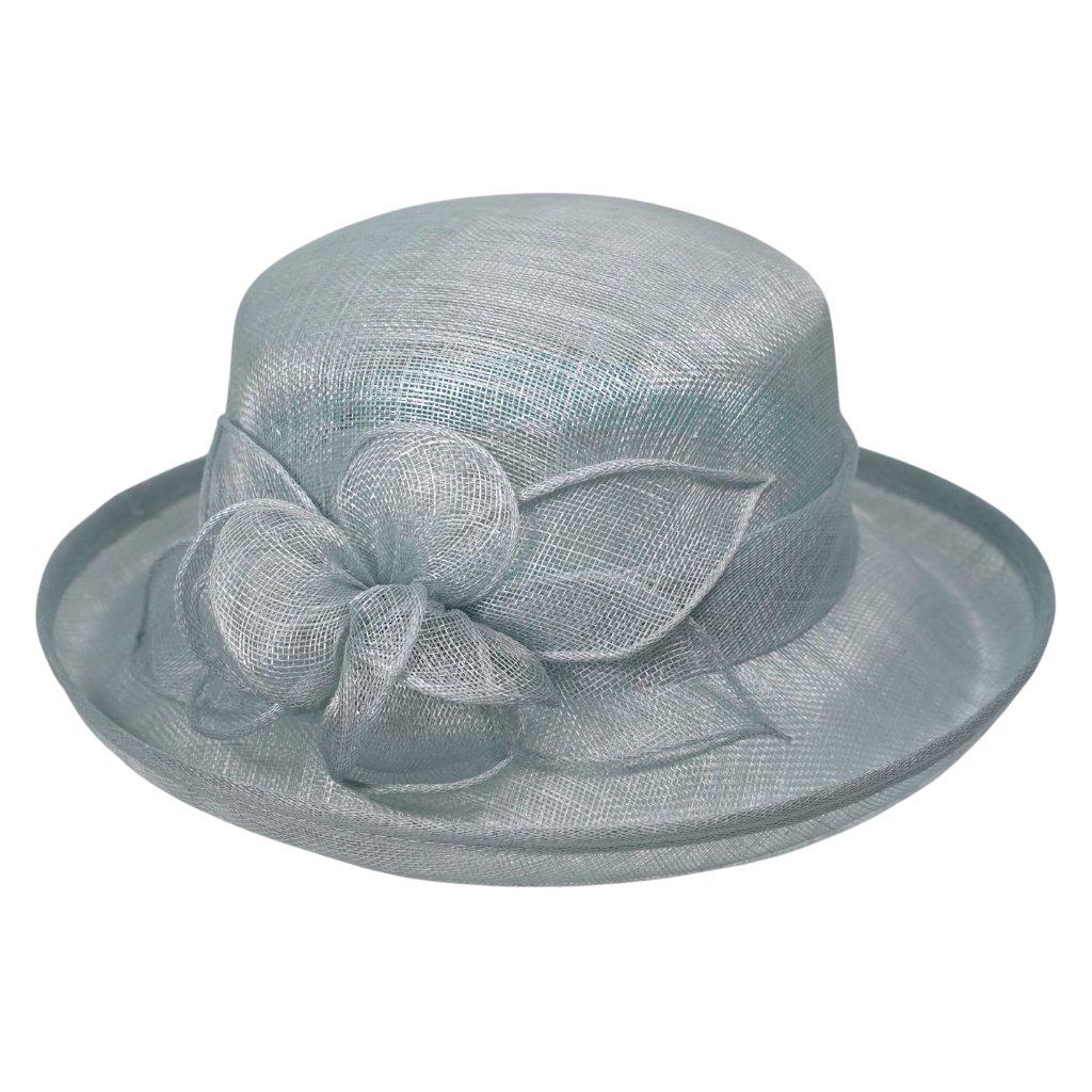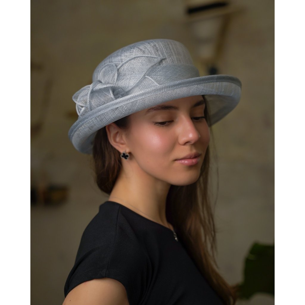 Cloche bledě modrý slavnostní klobouček s ozdobou - ze sisálové slámy