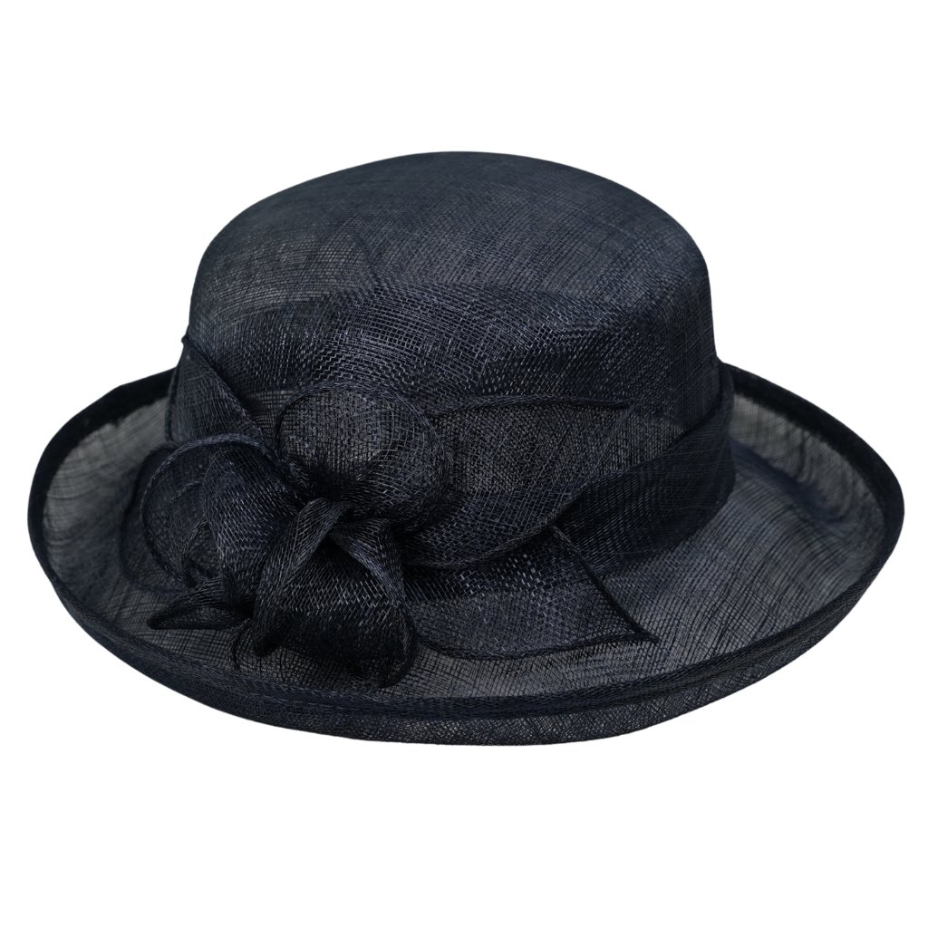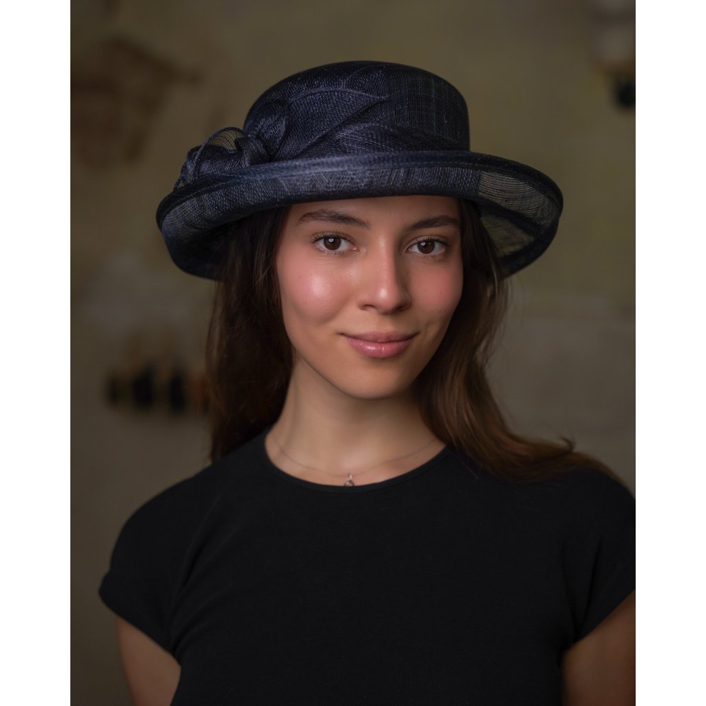 Cloche modrý slavnostní klobouček s ozdobou - ze sisálové slámy