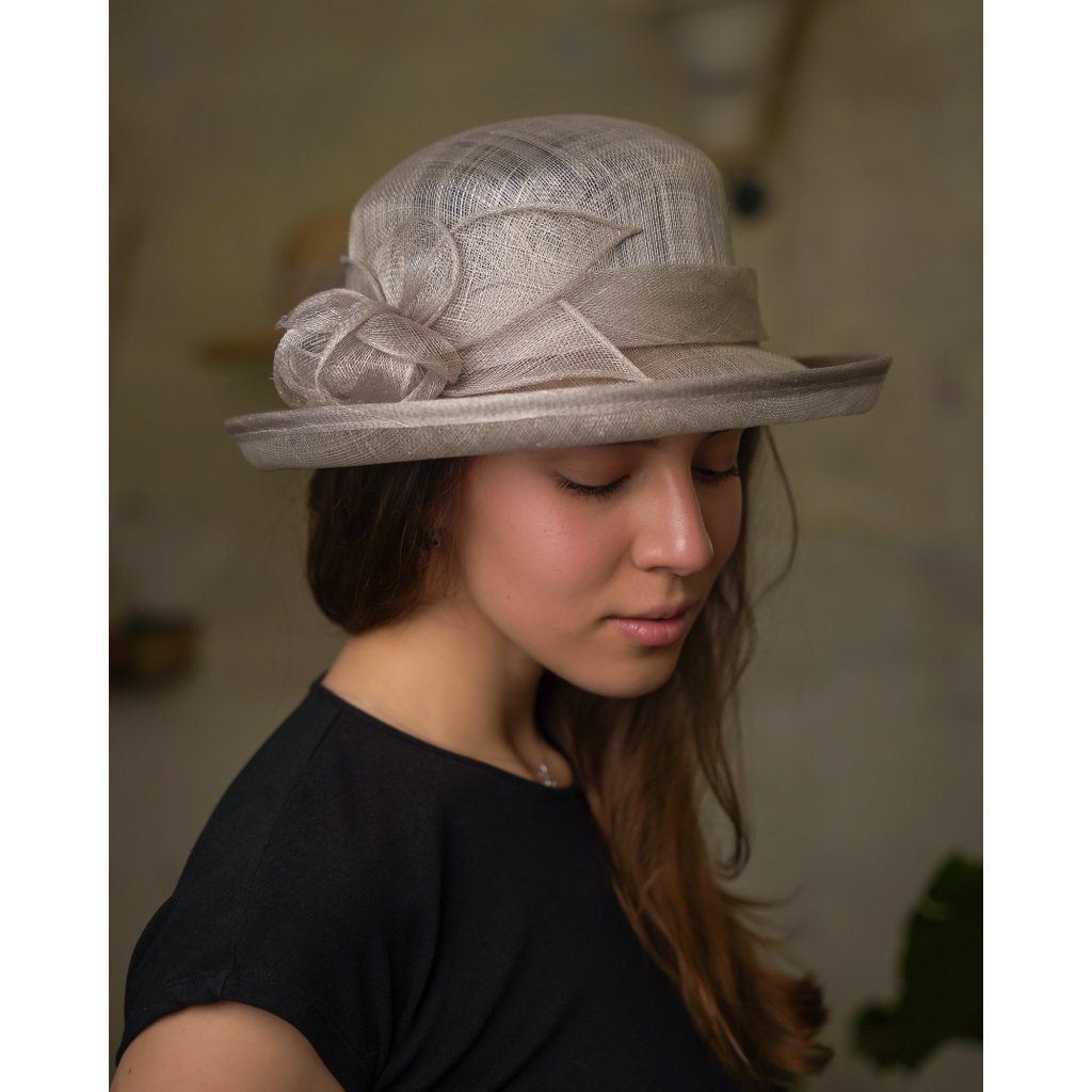 Cloche šedo béžový slavnostní klobouček s ozdobou - ze sisálové slámy