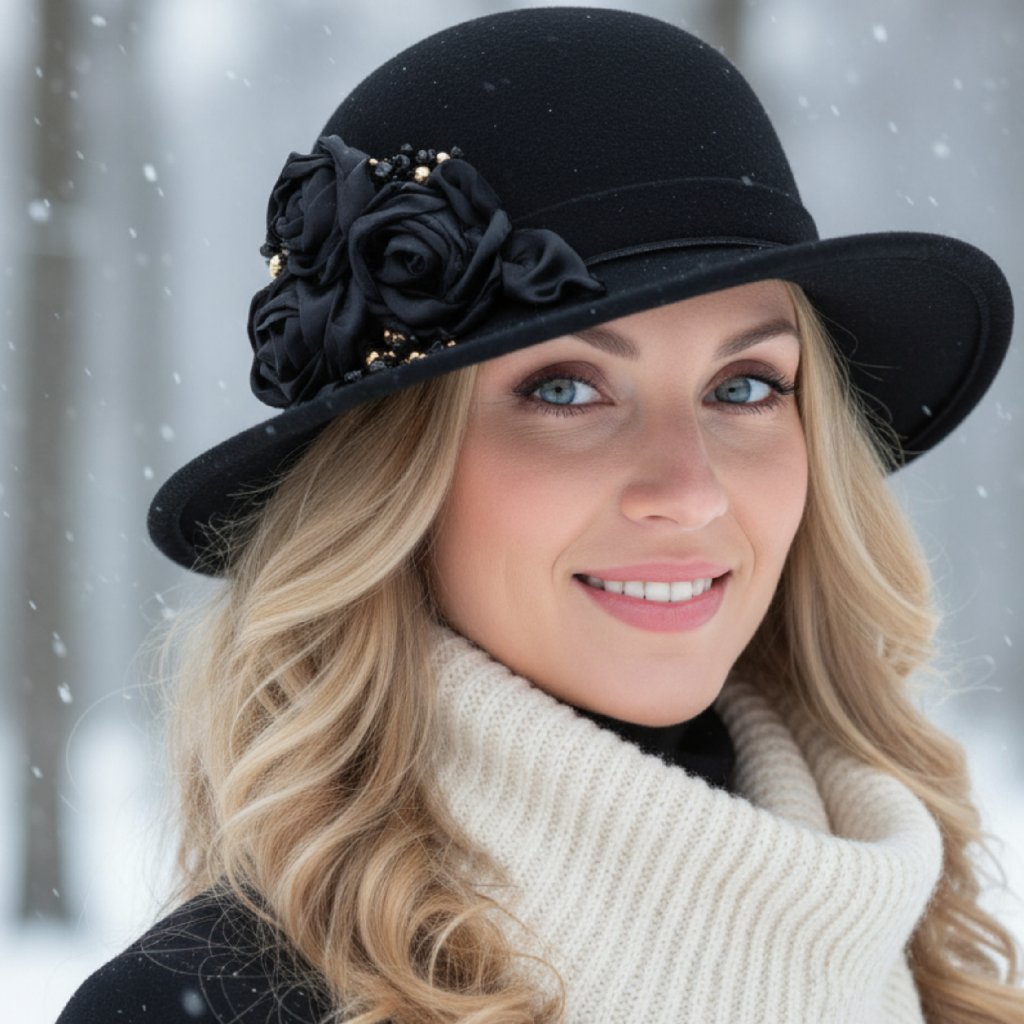Dámský černý vlněný klobouk zdobený. Velmi pohodlný nemačkavý klobouček.