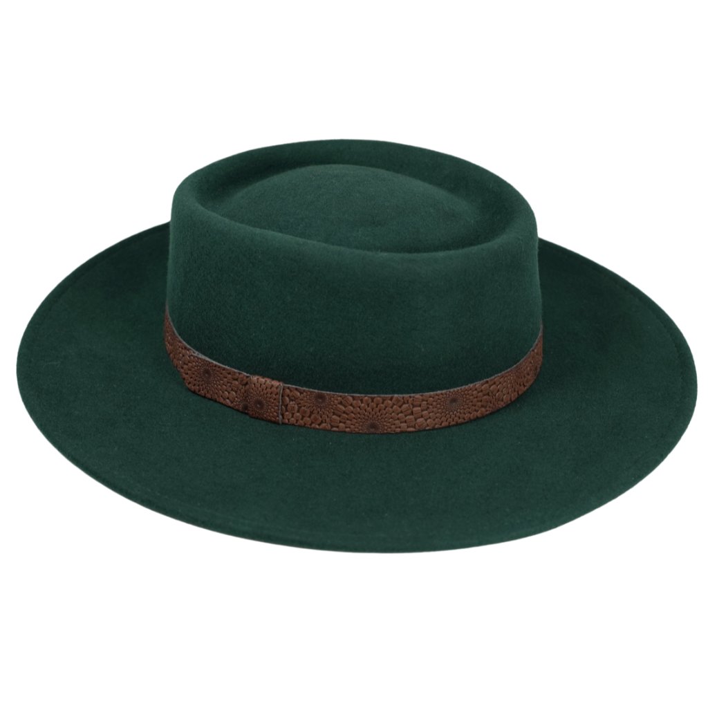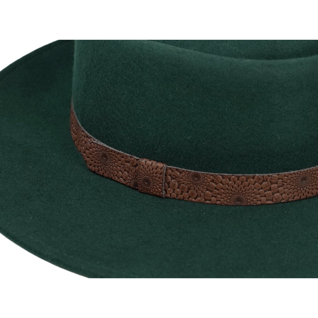 Dámský klobouk vlněný od Fiebig s širší krempou - zelený s hnědou koženou stuhou