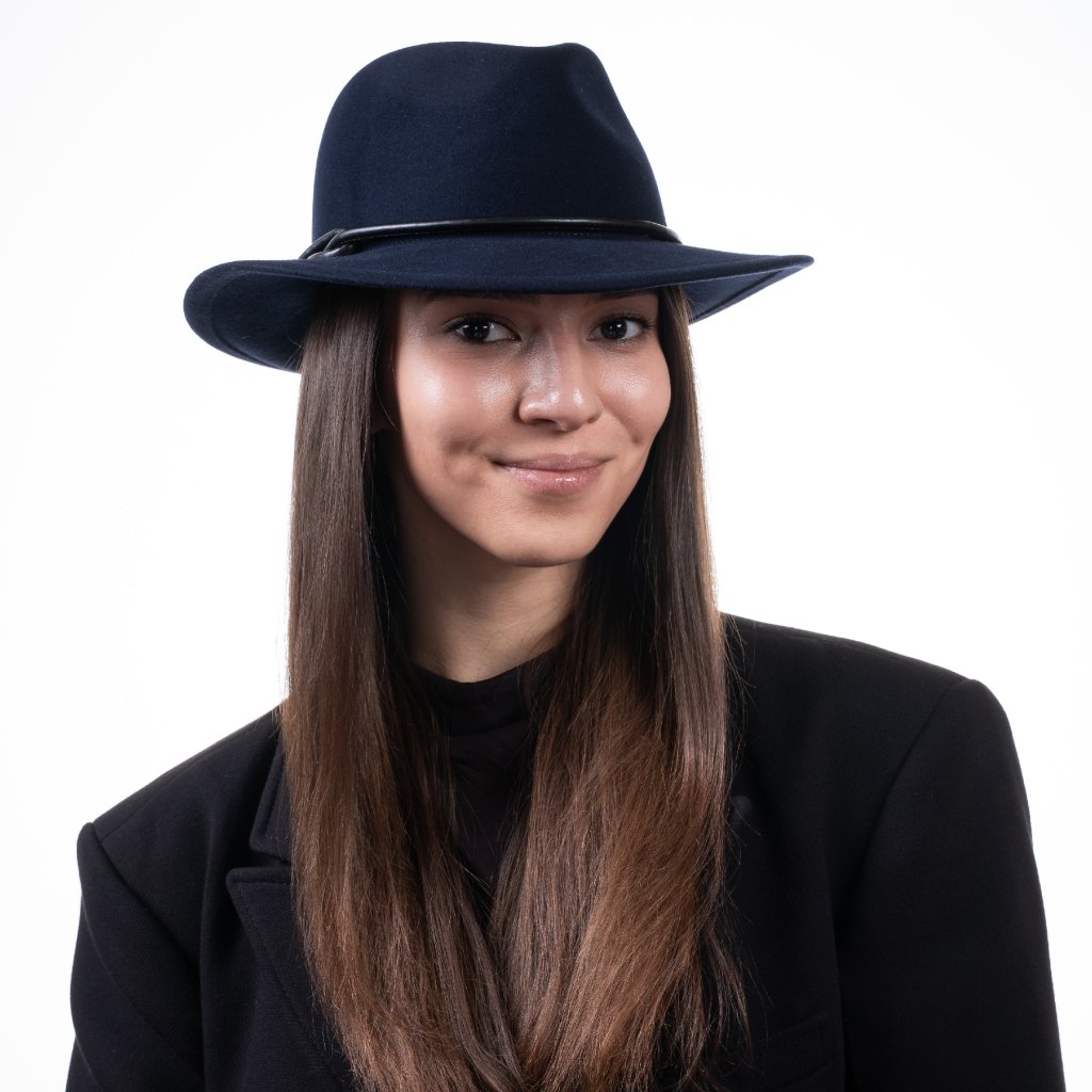 Hluboký modrý odstín krásně vyniká v kontrastu s jemnou strukturou směsi vlny a kašmíru, která patří mezi nejprémiovější materiály v kloboučnickém světě. Kašmír dodává plsti sametovou hebkost, vlna zase stabilitu, pevnost a výbornou tvarovou paměť.