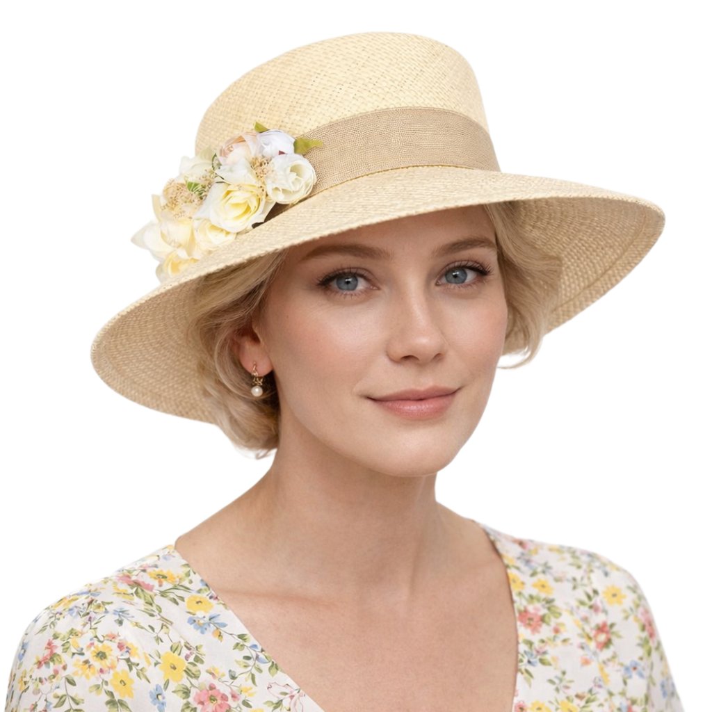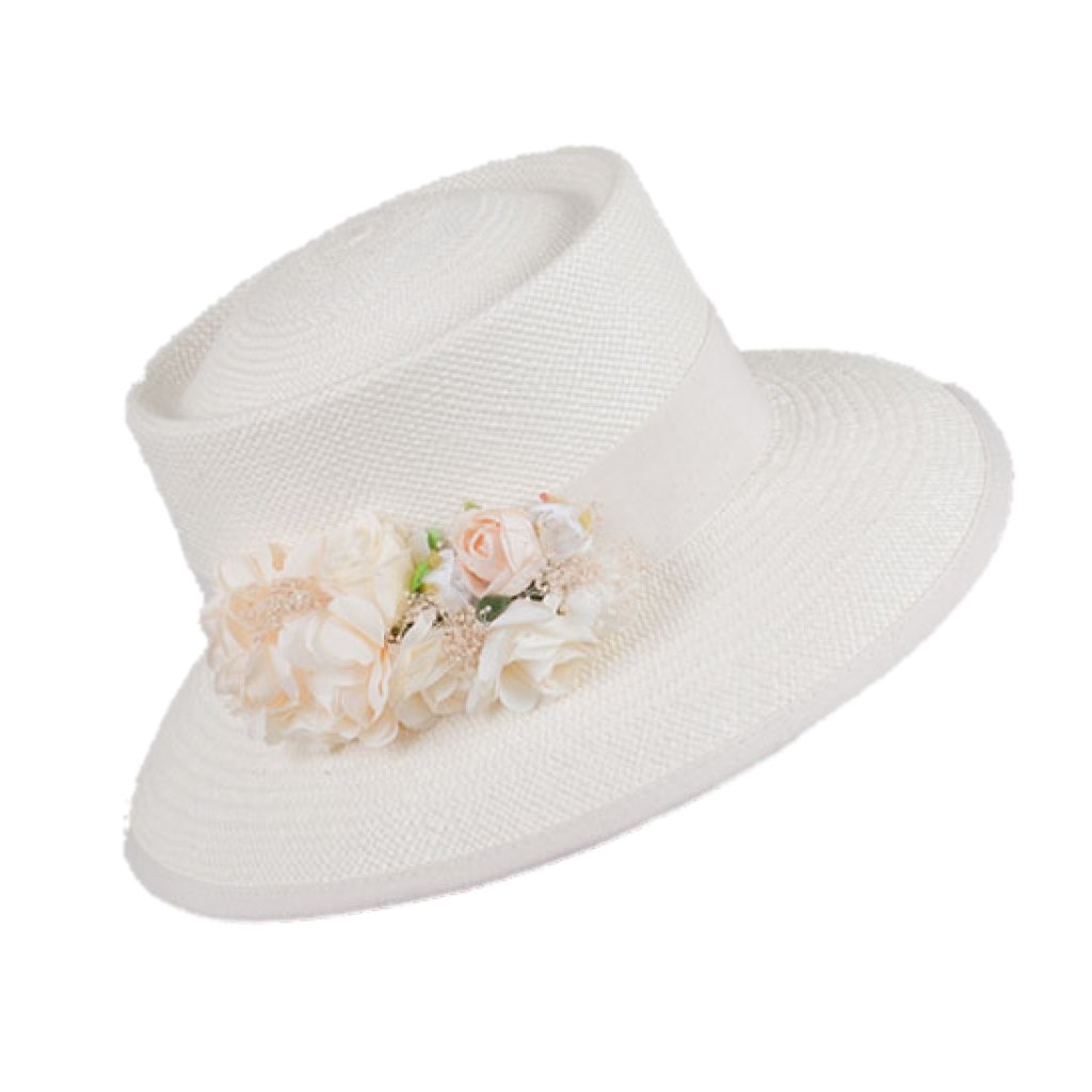 Tento panamský klobouk je navržen pro ženy, které hledají sofistikovaný doplněk s jemným výrazem. Čistý tvar a přirozená barva vytvářejí nadčasový základ, který je doplněn elegantní aplikací z umělých květin umístěnou na boční straně klobouku. Zdobení působí lehce, romanticky a podtrhuje slavnostní charakter modelu.