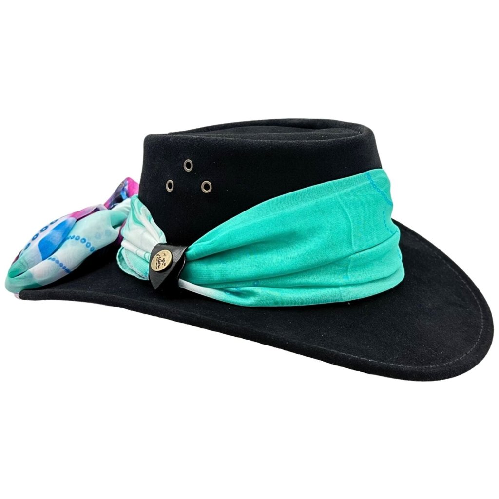Jacaru Jillaroo je klobouk pro ženy, které se nebojí kombinovat styl, praktičnost a trochu australského dobrodružství. Vyroben z jemně broušené hovězí kůže s matným povrchem, doplněný lehkým šátkem uvázaným kolem koruny, působí elegantně, žensky a přesto odolně.
