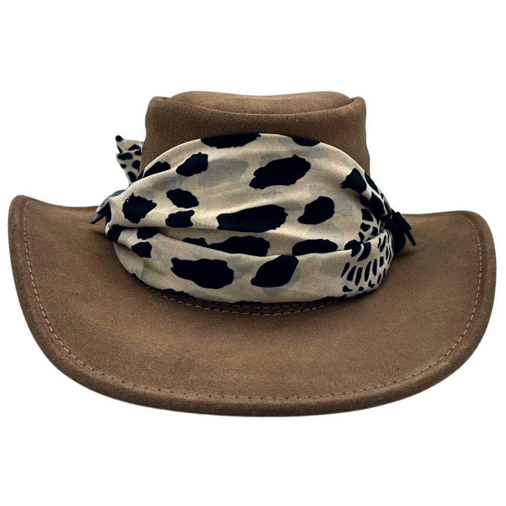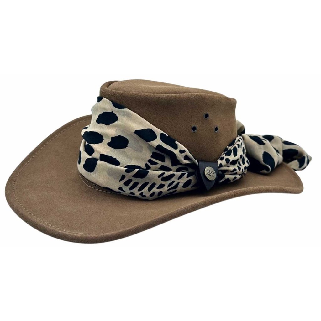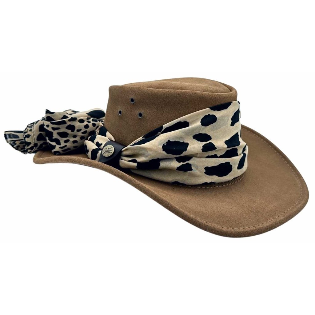 Jacaru Jillaroo je klobouk pro ženy, které se nebojí kombinovat styl, praktičnost a trochu australského dobrodružství. Vyroben z jemně broušené hovězí kůže s matným povrchem, doplněný lehkým šátkem uvázaným kolem koruny, působí elegantně, žensky a přesto odolně.