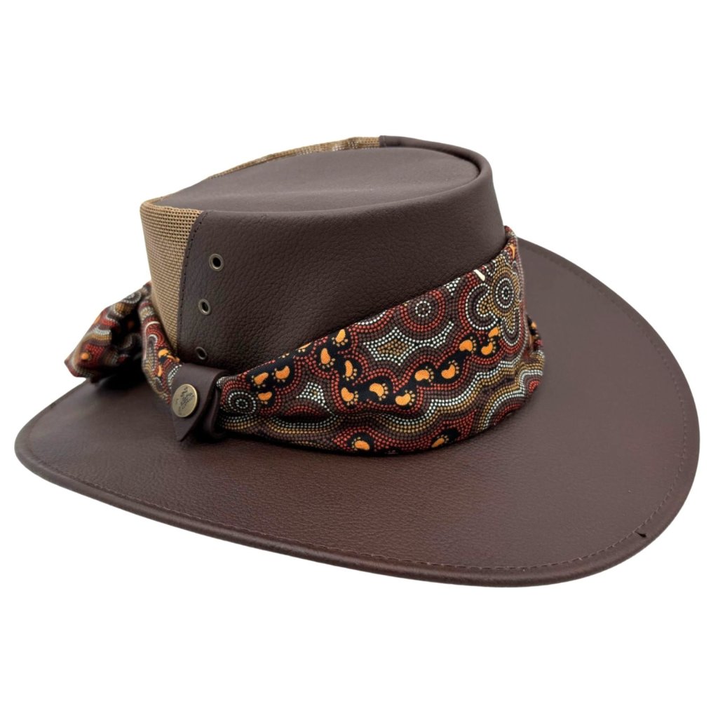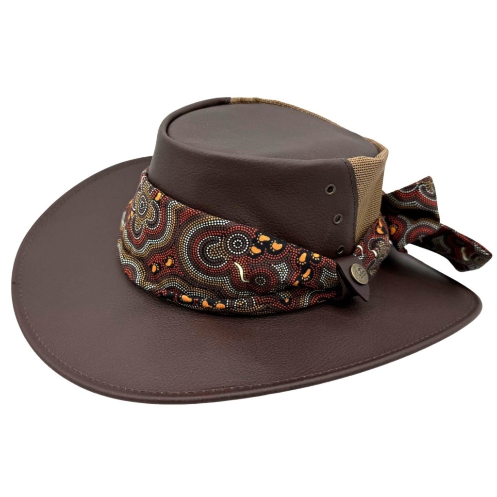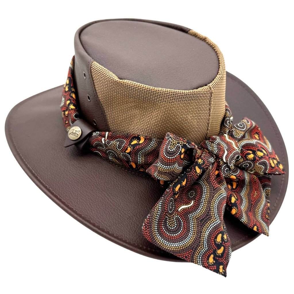 Kolem koruny je uvázaný široký šátek s tradičním australským (aboriginským) vzorem, který dodává klobouku výrazný styl a jedinečný charakter. Šátek je vyměnitelný – můžete jej nahradit jiným nebo si u nás dokoupit náhradní variantu.