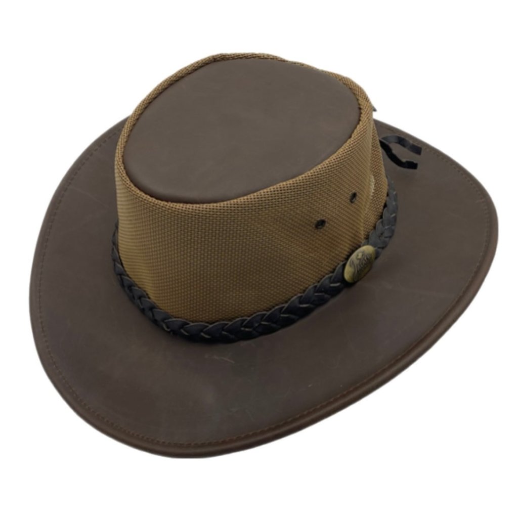 Krempa a dýnko jsou vyrobeny z houževnaté buvolí kůže, která dobře odolává vodě i času. Koruna z PVC síťovinyzajišťuje lepší proudění vzduchu, takže se v klobouku ani v parném dni neuvaříte. Nízká hmotnost a pohodlný střih z něj dělají ideální letní doplněk.