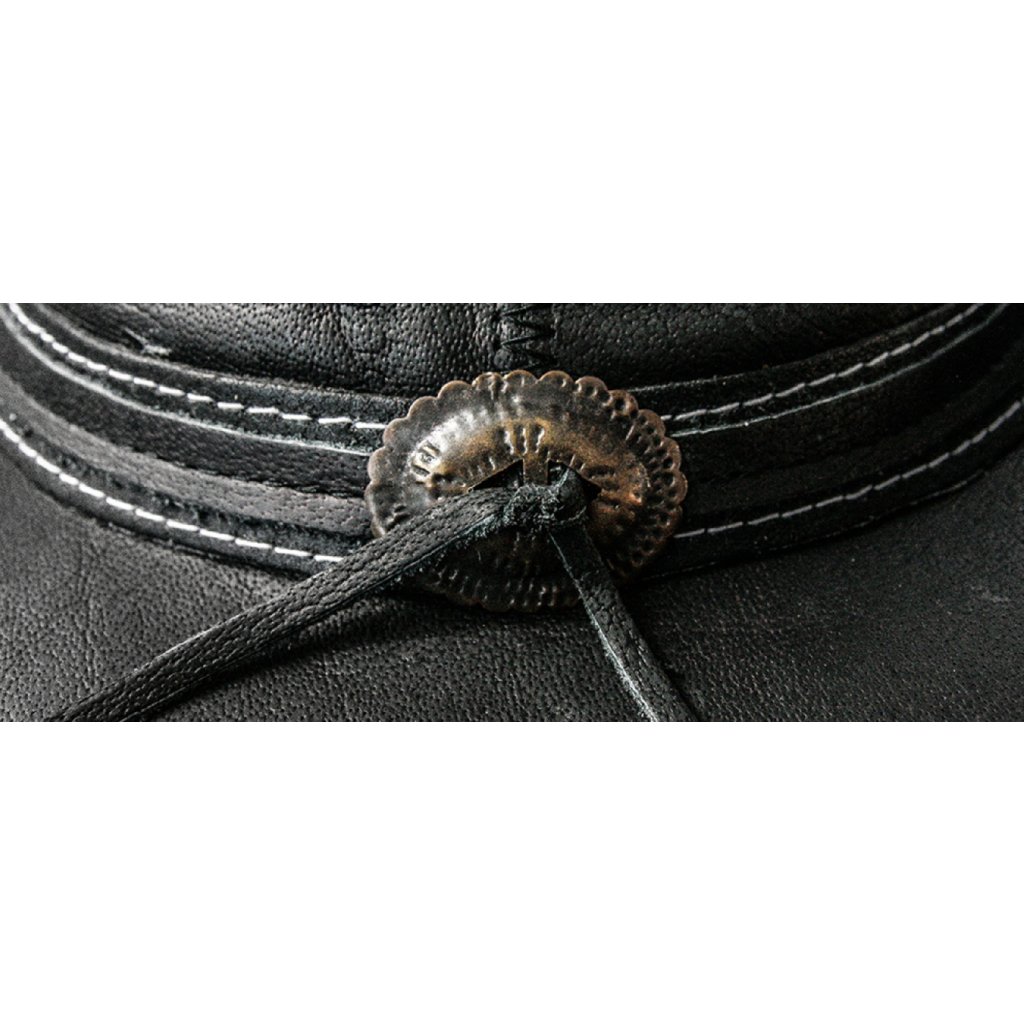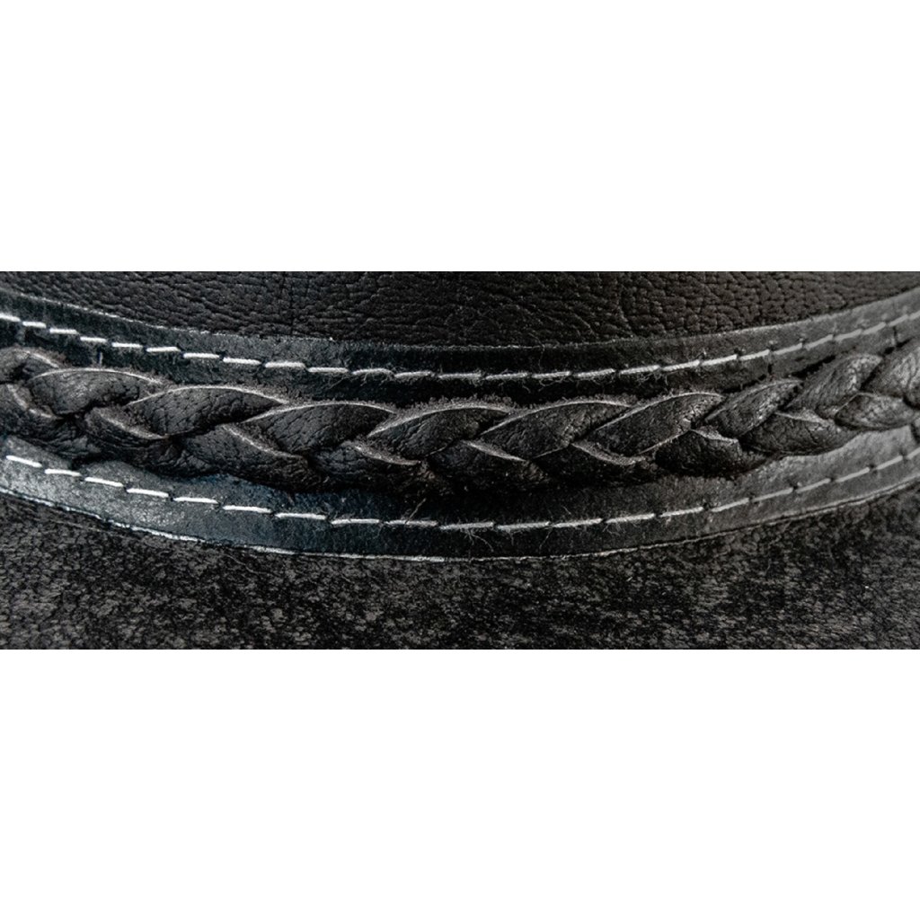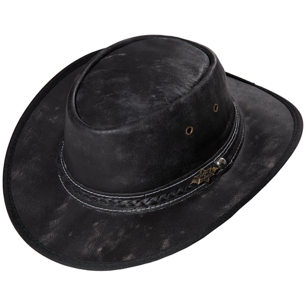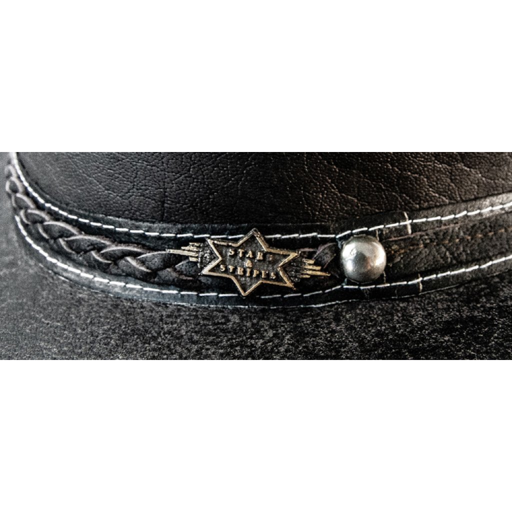 Skvělý westernový měkký klobouk z hovězí kůže. Lehká patina dodává dojem opotřebovanosti typické pro styl divokého západu. Stuha je kombinací koženého pásku a dvou spletených řemínků. Po stranách koruny dvě onýtované dírky díky kterým se v horkých dnech pod klobouk dostane vzduch. Na levé straně nechybí ozdoba v podobě nýtu a loga výrobce