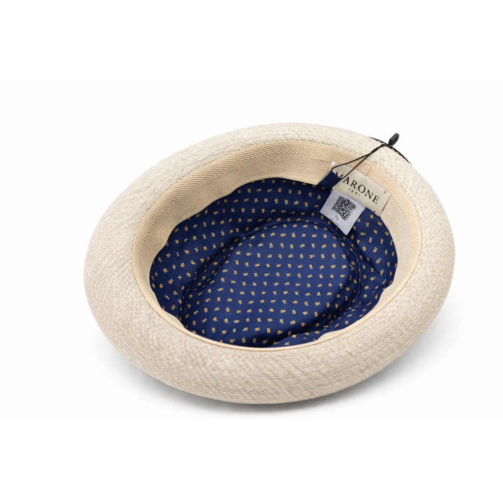 Uvnitř klobouku se nachází barevná bavlněná podšívka, která nejen příjemně překvapí při nošení, ale zároveň zvyšuje komfort a prodyšnost. Klobouk dobře drží tvar a působí upraveně, aniž by ztrácel svou uvolněnou letní atmosféru.