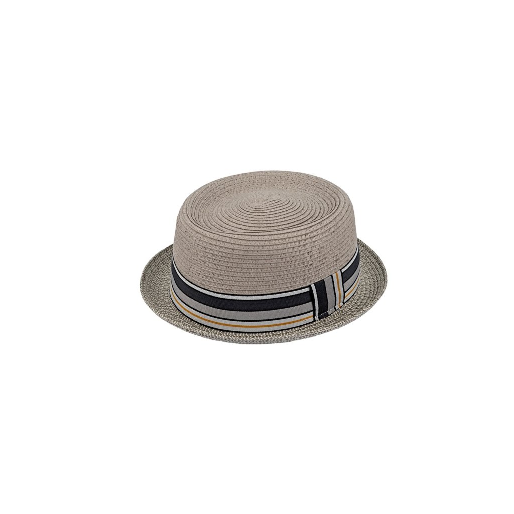 Letní klobouk Pork Pie – béžový s pruhovanou stuhou
