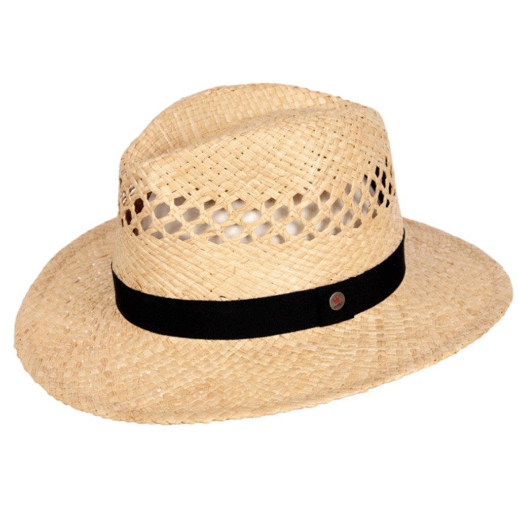 Lehký traveller klobouk z přírodní rafie, ideální pro horké letní dny. Perforovaný pruh v koruně zajišťuje příjemnou ventilaci, takže hlava zůstává svěží i při dlouhém nošení. Klasická černá ripsová stuha dodává klobouku elegantní kontrast a nadčasový styl. Dostupný ve třech velikostech, vhodný na cestování, do města i k moři.