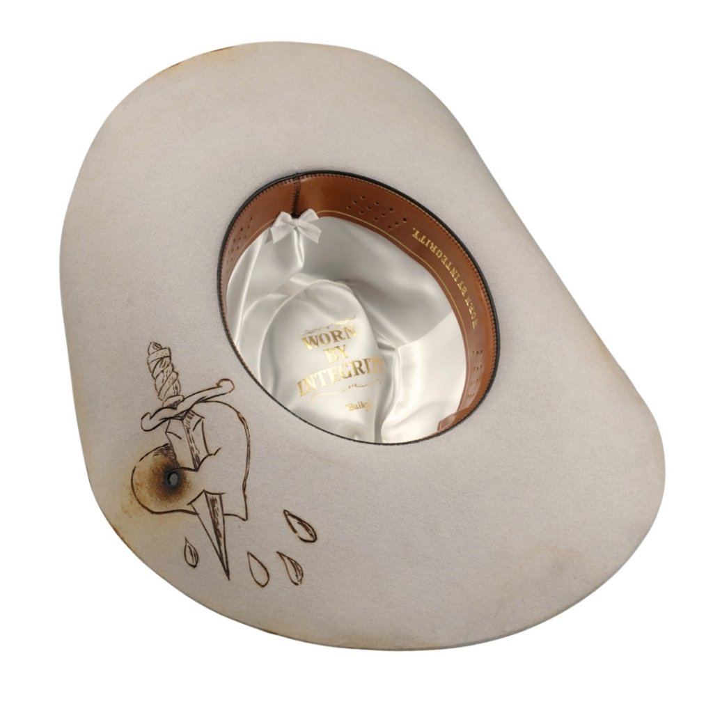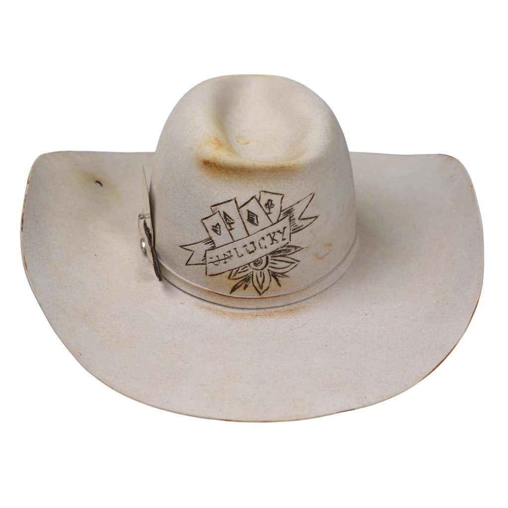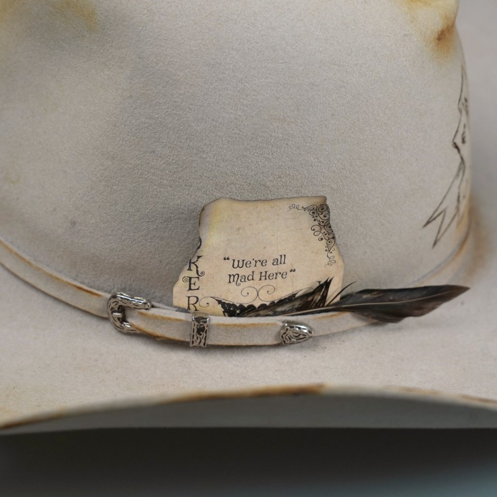 Klobouk nese motivy vypálené do plsti – symbol dýky v srdci, hrací karty „Lucky“ a nápis „We’re all mad here“ – odkazy na svobodu, osud i osobní příběh každého, kdo ho nosí. Jemná patina a stopa ruční práce dávají klobouku autentický „western worn“ vzhled, jako by prožil stovky mil na prašných cestách.