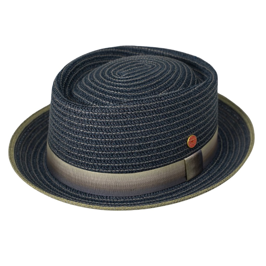 Modrý porkpie klobouk od Mayser Andy - hnědo bíla stuha