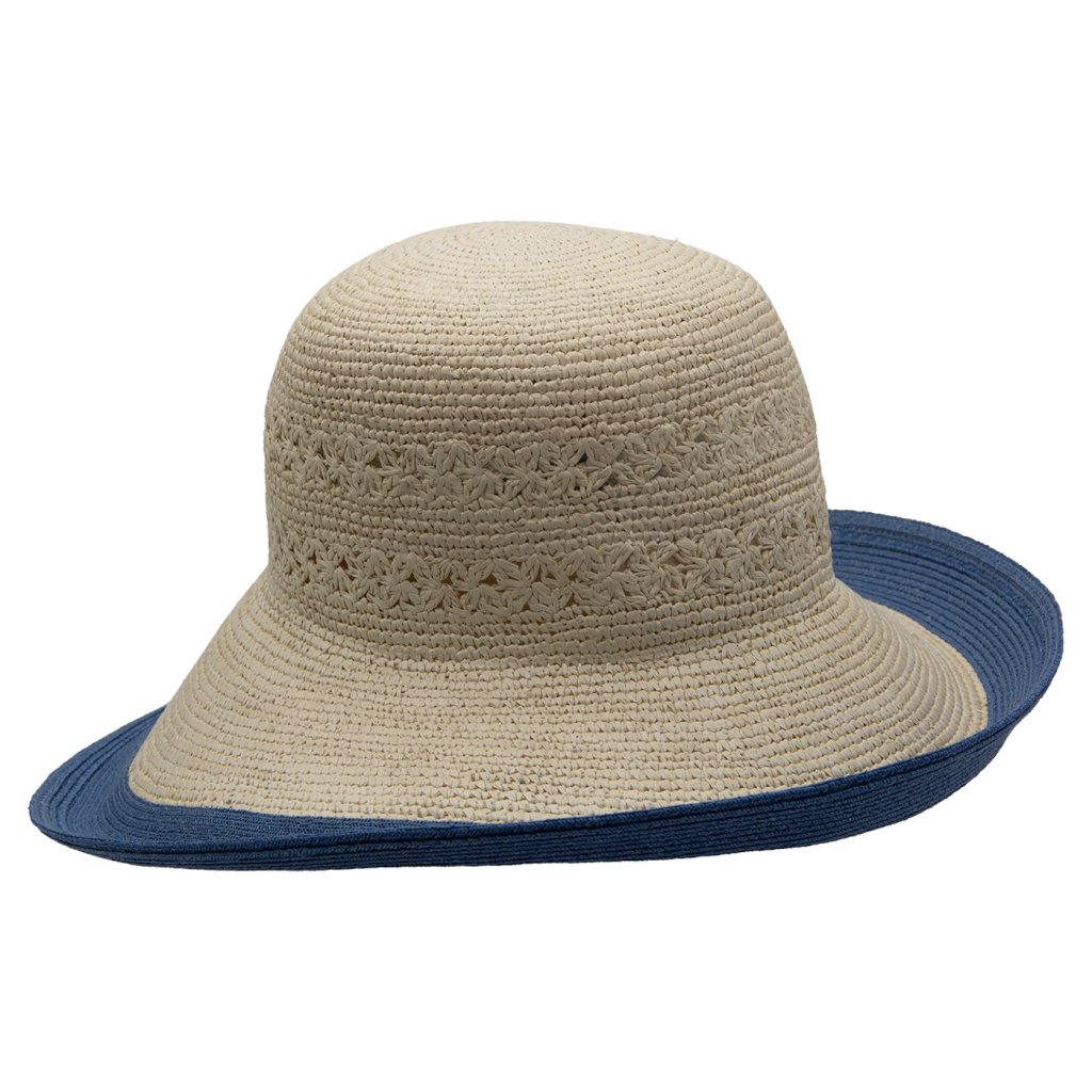 Panamský klobouk - Cloche s širší asymetrickou krempou a modrým okrajem - Sally - UV faktor 80