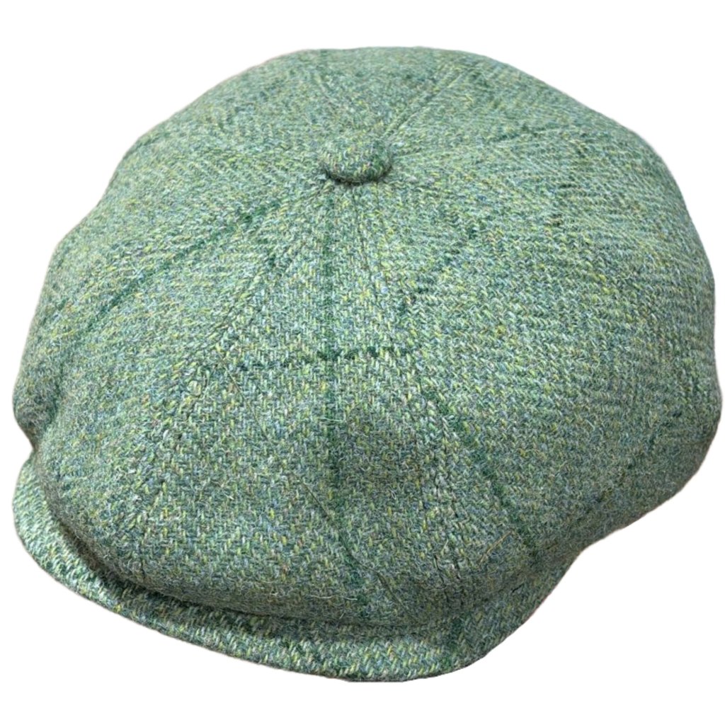 Zelená 8dílná newsboy bekovka z pravé Harris Tweed. Ručně tkaná skotská vlna, jemný káro vzor a nadčasový vintage tvar.