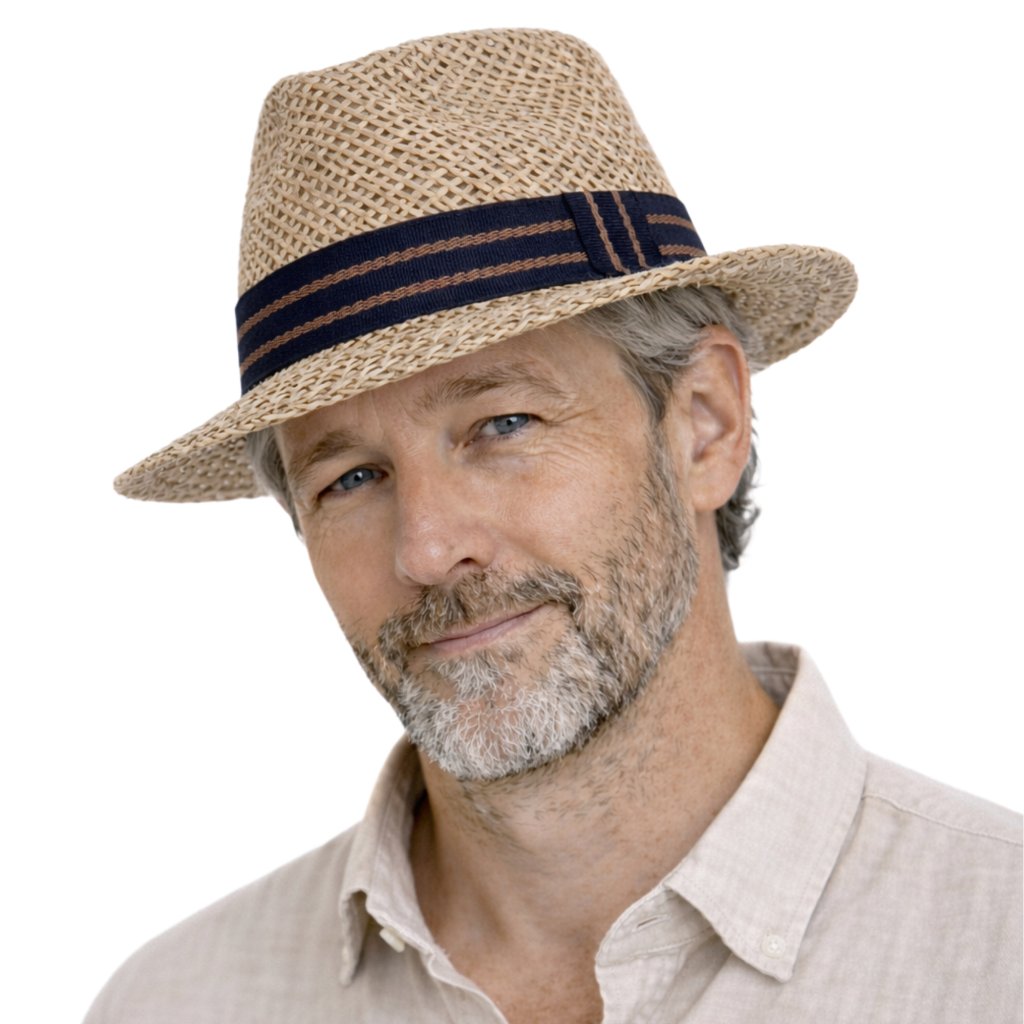 Slaměný klobouk z mořské trávy s dvoubarevnou modrou stuhou - Fedora